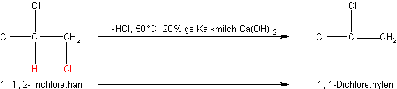 1,1-Dichlorethylen CH2=CCl2 oder Vinylidenchlorid (Siedepunkt 37 °C, Dichte 1,213 g/ml [20°C], schwer brennbar) wird aus 1,1,2-Trichlorethan durch HCl - Abspaltung hergestellt:
