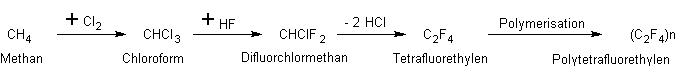 Betrachtet man die Reihe der Zwischenprodukte, die zur Herstellung des C2F4 durchlaufen werden müssen, stellt man fest, daß der daraus herstellbare Kunststoff auf der Rohstoffbasis Methan (Erdgas) beruht: