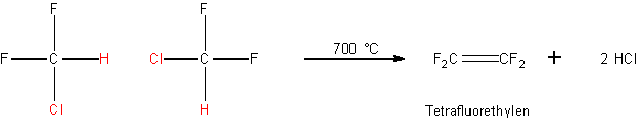 Ausgangsprodukt ist Difluorchlormethan CHClF2 F22, das bei 700 °C durch Rohre aus Platin geleitet wird, wobei 2 Moleküle HCl abgespalten werden: