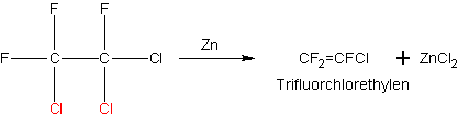 Ausgangsstoff ist 1,1,2-Trifluor-trichlor-ethan F 113, das in eine Aufschlämmung von Zink-Pulver in Methanol eingeleitet wird, wobei eine Cl2-Abspaltung stattfindet: