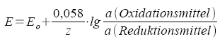 und In zu lg zusammengefaßt: bei 15°C 0,057 bei 20°C 0,058 bei 25°C 0,059 Zur Berechnung von Redox - Potentialen z. B. in der Maßanalyse |