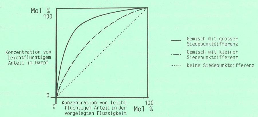 Je weiter die Siedetemperatur bzw. Dampfdrücke der zu trennenden Komponenten auseinander liegen, umso größer ist die Anreicherung von niedersiedendem Anteil im Dampf, d. h. umso besser lässt sich ein solches Gemisch mittels Destillation trennen.