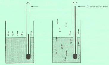 Wird durch Temperaturerhöhung, oder durch Vermindern des Umgebungsdruckes, der Dampfdruck einer Flüssigkeit gleich gross wie der Umgebungsdruck, bilden sich im Inneren der Flüssigkeit Dampfblasen und es treten an all diesen Grenzflächen Moleküle aus. Die Flüssigkeit siedet, und es verdampft eine wesentlich grössere Menge Flüssigkeit pro Zeiteinheit als beim Verdunsten.