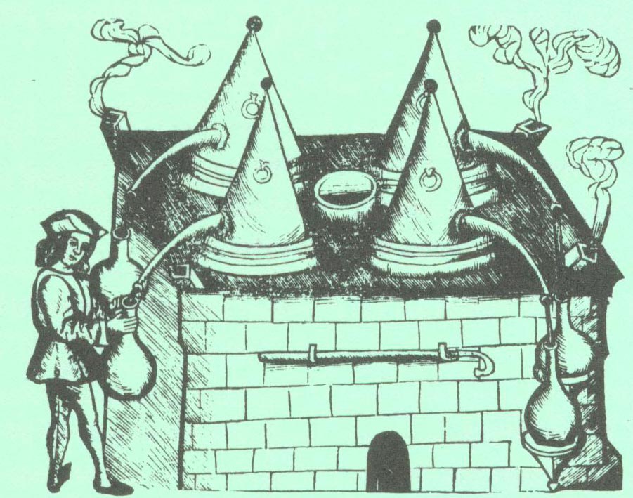 Ofen für vier Destillierblasen mit Rosenhut ( Luftkühlung) / Lit.: "Das nüv Buch der rechten Kunst zu distillieren" Srassburg 1509