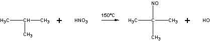 Diese Reaktion verläuft bei Alkanen schwierig, weil das Nitrierungsmittel, die konz. Salpetersäure, nur langsam einwirkt. Der Wasserstoff wird dabei durch die NO2-Gruppe ersetzt. Geht man von einem verzweigten Kohlenwasserstoff (Isobutan) aus, verläuft die Nitrierung mittels konz. Salpetersäure nur mit 22% Ausbeute.