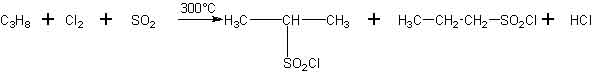 Bei dieser Reaktion wirkt Chlor mit Schwefeldioxid gleichzeitig auf Alkane ein; katalysierend wirkt wieder Bestrahlung mit UV-Licht und hohe Temperatur. Aus Propan entstehen auf diese Weise zwei Produkte zu gleichen Teilen: