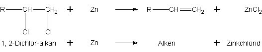 Auch aus Halogenalkanen mit vicinalen (benachbarten) Cl-Atomen können Alkene erhalten werden, wenn beide Cl-Atome durch eine energische Reaktion abgespalten werden, z. B. durch Kochen des Halogenalkans mit Zinkstaub in Alkohol.
