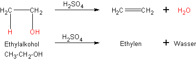 Alkohole gehen bei Gegenwart von wasserentziehenden Mitteln (H2SO4, H3PO4, ZnCl2) in Alkene über, wobei von benachbarten C-Atomen H und OH abgespalten werden, die sich zu H2O verbinden: