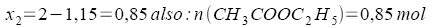 Nach der Reaktionsgleichung sollte stöchiometrisch 1 mol Ester entstehen, auf Grund der Gleichgewichtslage entstehen 0,85 mol Ester. Die höchstens erzielbare Ausbeute, bezogen auf C2H5OH beträgt somit 85% der Theorie. Bei der Reaktion werden (1-0,85) mol = 0,15 mol C2H5OH nicht umgesetzt.