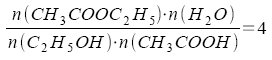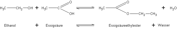 Für die Umsetzung von Ethanol C2H5OH mit Essigsäure, Ethansäure, CH3COOH zu Essigsäureethylester, Ethylacetat, CH3COOC2H5 und Wasser H2O hat die Gleichgewichtskonstante K bei 25°C den Zahlenwert 4 (hier ohne Einheit):