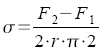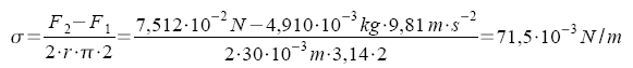 Berechne die Oberflächenspannung von Wasser bei 25 °C. Masse des Ringes m = 4,910 g; Zugkraft vor dem Abreißen F2 = 7,512 * 10-2 N; Durchmesser des Ringes d = 60 mm.