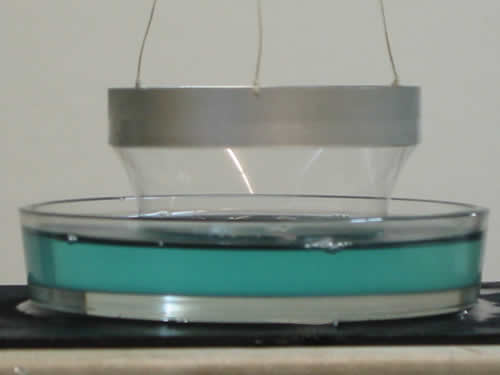 Ein Aluminiumring mit einer scharfen Schneide ist an drei Fäden an einem Kraftmesser aufgehängt. Der Kraftmesser hängt selbst wieder an einem Faden, der über eine Rolle führt. Der eingetauchte Ring wird an die Wasseroberfläche gebracht. Bei weiterem Ziehen hebt die Schneide eine dünne ringförmige Flüssigkeitsschicht aus der Oberfläche. Diese Schicht besitzt zwei Oberflächen. Unmittelbar vor dem Abreißen der Schicht wird der Kraftmesser abgelesen.