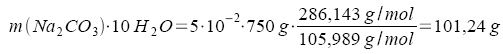 Wieviel Gramm "Kristallsoda", Natriumcarbonat-10-hydrat Na2CO3*10H2O, müssen zum Herstellen von 750 g 5%iger Natriumcarbonatlösung eingewogen werden?