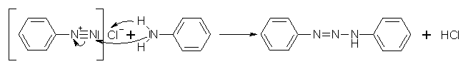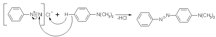 Mit der Sandmeyer-Reaktion wird ein weiterer Weg zur Herstellung von Chlor- und Brombenzen dargestellt. Um die Sandmeyer-Reaktion durchzuführen läßt man eine wäßrige, aromatische Diazoniumsalzlösung in eine warme Kupfer(I)-chlorid, bzw. -bromid, Lösung, die mit Salzsäure, bzw. Bromwasserstoffsäure, angesäuert wurde, fließen. Das Kupfer(I)-halogenid dient als Katalysator. Es bildet mit dem Diazoniumion einen „Primärkomplex", der in der Wärme Stickstoff abspaltet. Dabei kommt es zu einer Einelektronenübertragung vom Kupfer(I) zum Stickstoff, wobei das Kupfer(I) in Kupfer(II) übergeht. Das Kupfer(II)-halogenid wird durch das intermediär gebildete Phenylradikal wieder zum Kupfer(I)-halogenid reduziert und es entsteht das Halogenbenzen. Ein Sonderfall der Sandmeyer-Reaktion ist die Substitution der Diazogruppe durch die Cyangruppe. Als Edukte werden hier eine Diazoniumsalzlösung und mit Kaliumcyanid komplex gelöstes Kupfer(I)-cyanid (K3[Cu(CN)4]). Als Produkt entsteht hierbei Benzonitril.