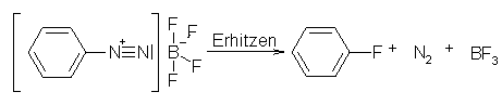 Durch die Schiemann-Reaktion sind Fluorarene zugänglich. Die Reaktion verläuft ähnlich der Sandmeyer-Reaktion. Die Fluorierung ist durch die thermische Zersetzung von Diazoniumtetrafluorboraten möglich. Hierbei kann auf eine Zugabe eines Katalysators verzichtet werden. Um die Fluorierung zu erreichen gibt man zu der Lösung eines aromatischen Diazoniumsalzes HBF4. Hierdurch wird das Diazoniumtetrafluorborat gebildet. Wenn man dieses Salz auf ca. 120°C erwärmt,wird Stickstoff und BF3 abgespalten und es entsteht das entsprechende Fluoraren.