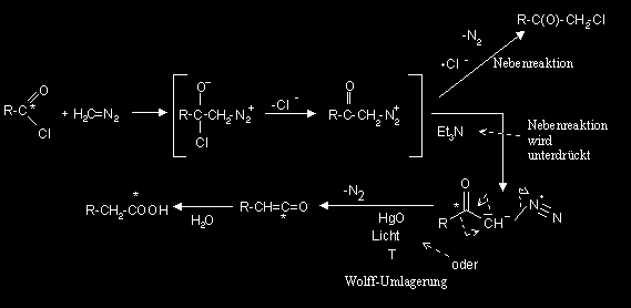 Reaktion zur Homologisierung von Carbonsäuren mit Hilfe von Diazomethan.