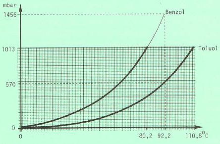 Bei der Siedetemperatur des Gemisches ( 92,2°C ) hätte Benzol theoretisch einen Dampfdruck von 1456 mbar, Toluol einen solchen von 570 mbar.